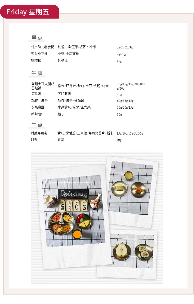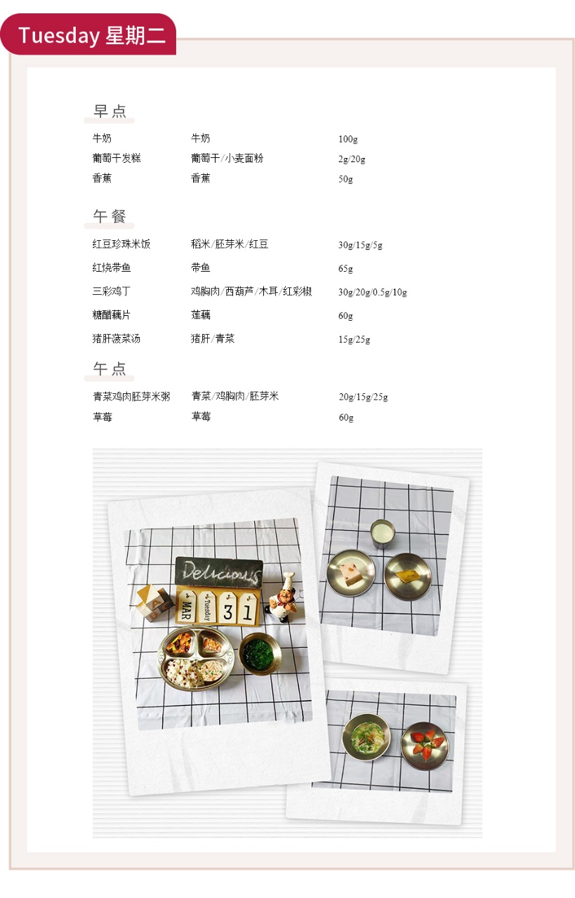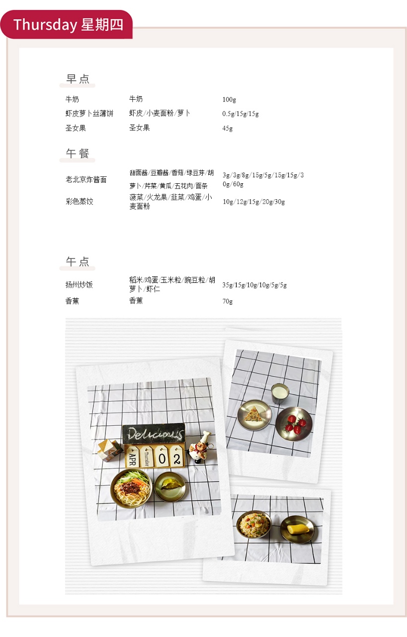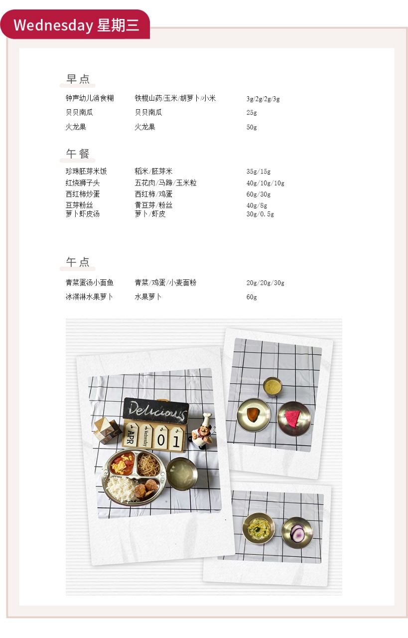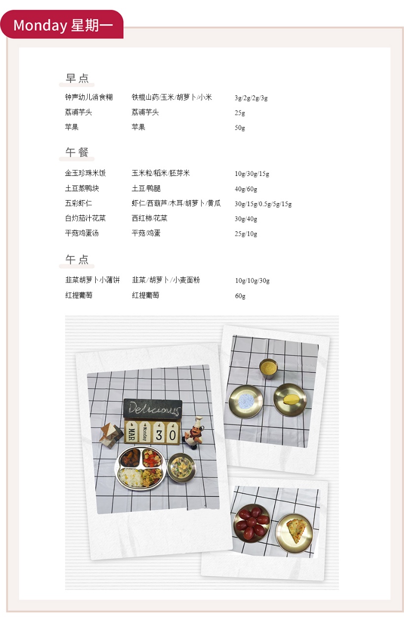 为了让宝贝们在幼儿园吃得科学、营养又美味,我们精心制定本周食谱,从早点、午餐到午点,每一份食材都经过严格筛选,兼顾口感与营养,助力宝贝们健康成长。